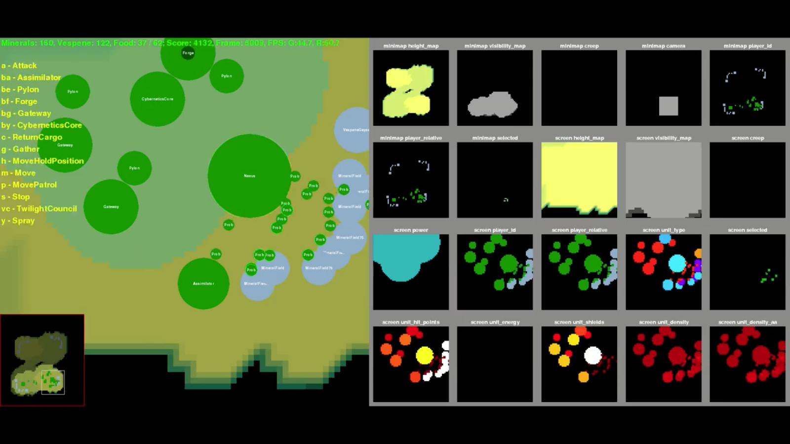 Since StarCraft 2 is a complicated game with lots of information, Deepmind has scaled all of this down. Instead of getting the entire screen contents in full resolution, we have two main things; the screen and minimap.